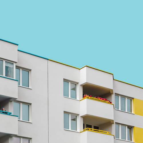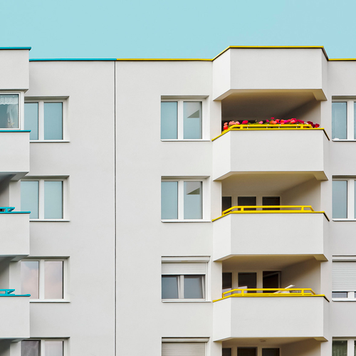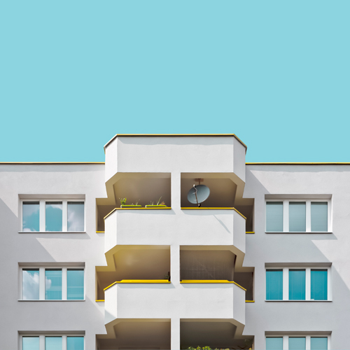using unnatural-, artificial perspectives, combined with digital alterations, the buildings merely become templates for his own visual trademark.